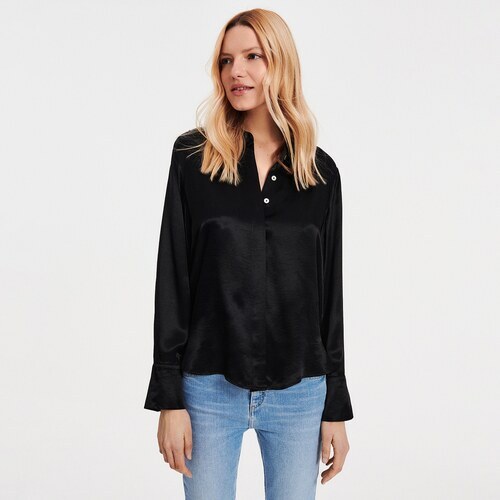Reserved - Koszula z satynowej wiskozy - Czarny czarne bluzki damskie z krótkim rękawem
