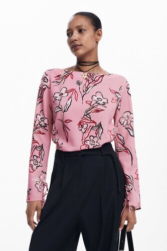 Długa bluzka z czerwona bluzka koszulowa nadrukiem