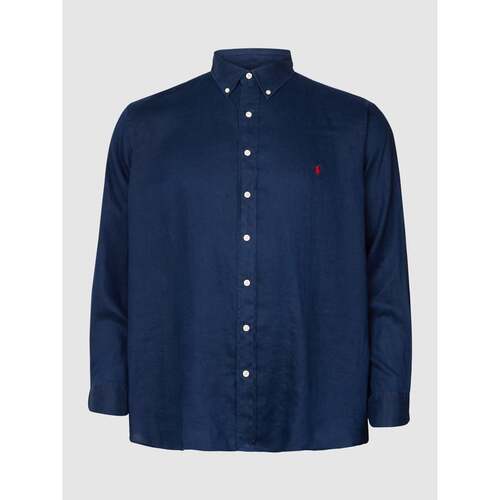 Medicine koszula lniana męska kolor granatowy regular z kołnierzykiem button-down