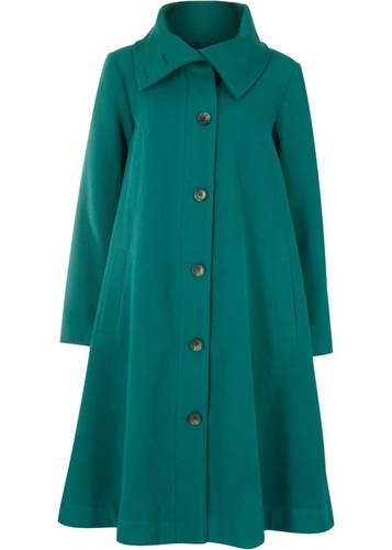 Płaszcz z materiału w optyce wełny, fason o linii litery A z szeroką stójką