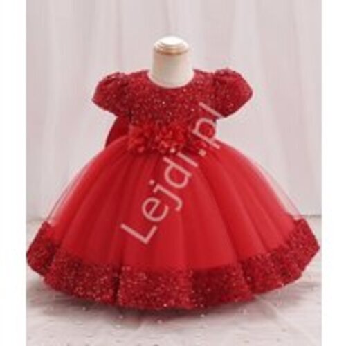 Czerwona krótka sukienka wieczorowa dla dziewczynki z cekinami i kwiatkami święta, Boże Narodzenie153