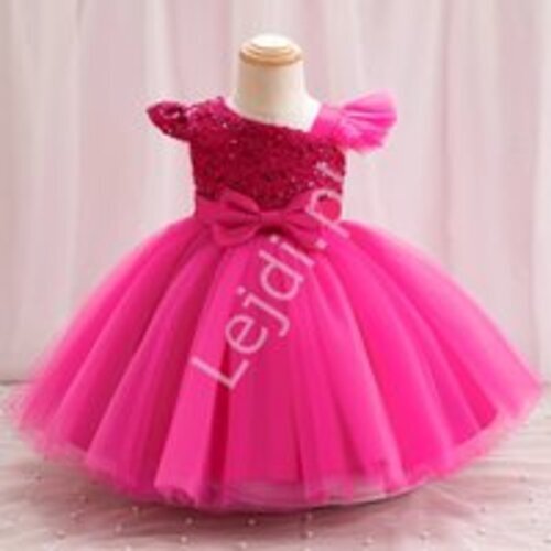 Ciemno różowa sukienka z cekinami i tiulem dla dziewczynki z dłuższym tyłem 183