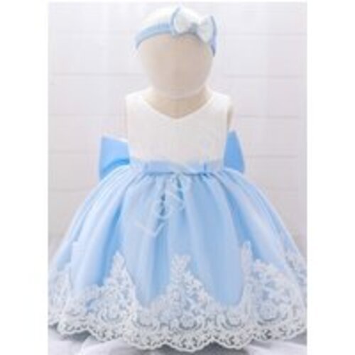 Błękitna sukienka dla dziewczynki z białą koronką w komplecie opaska na głowę 911