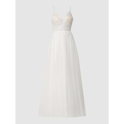 Suknia ślubna z kwiatowymi haftami i ozdobnymi perełkami
