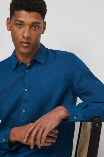 Medicine koszula lniana męska kolor granatowy regular z kołnierzykiem klasycznym