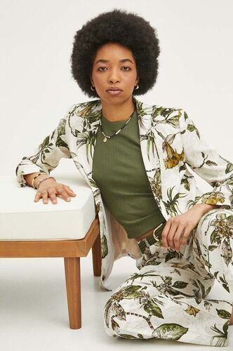 Medicine marynarka lniana damska kolor beżowy jednorzędowa wzorzysta