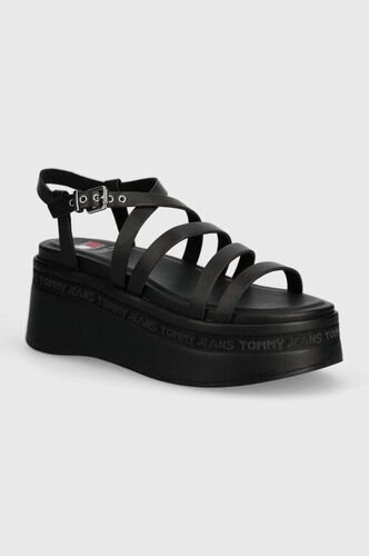 Tommy Jeans sandały skórzane TJW STRAPPY eleganckie sandałki na szpilce WEDGE SANDAL kolor czarny EN0EN02516