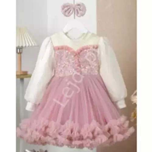 Krótka wizytowa dziewczynki w sukienkach sukienka dla dziewczynki różowa z długim rękawem1319 + kokarda spinka