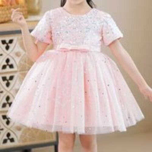 Krótka sukienka wieczorowa dla dziewczynki z cekinami i gwiazdkami jasny róż 6632