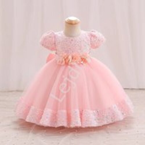 Sukienka z cekinami i tiulem dla dziewczynki w kolorze jasno różowym z dłuższym tyłem 183