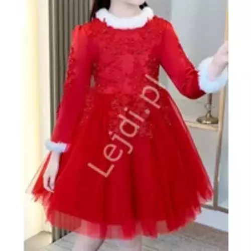 Długa ocieplana czerwona sukienka dla dziewczynki z futerkiem na bal przedszkolny, Mikołajka, bal świąteczny, święta Boże Narodzenie CR683