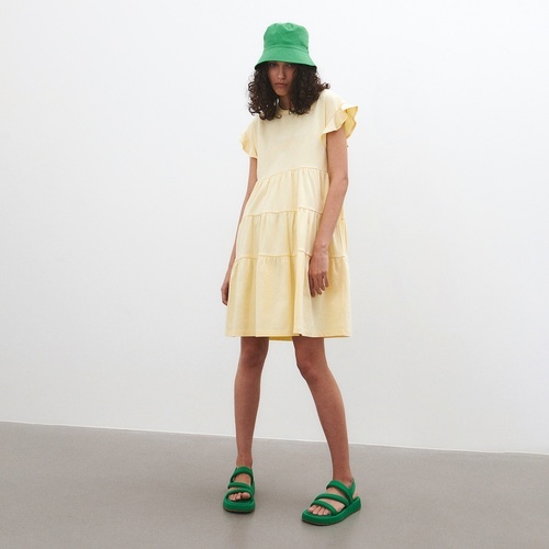 Sukienka midi z czystej wiskozy z obszyciem falbanami żółta elegancka sukienka