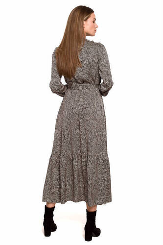 Długa sukienka w lamparci wzór z falbaną u dołu