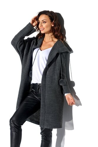 Oversizowy dłuższy sweterki jesienne damskie kardigan z kapturem i pomponami